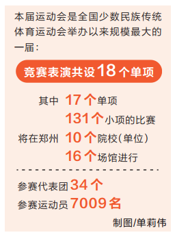 據(jù)競賽表演部相關(guān)負(fù)責(zé)人介紹,本屆民族運動會競賽表演共設(shè)18個單項,馬上項目比賽已于7月12日至17日在呼和浩特圓滿結(jié)束,其他17個單項,131個小項的比賽將在鄭州10個院校(單位)、16個場館進(jìn)行;參賽代表團(tuán)34個,參賽運動員7009名,是全國少數(shù)民族傳統(tǒng)體育運動會舉辦以來規(guī)模最大的一屆。另外,本屆運動會還將突出河南省武術(shù)大省的優(yōu)勢,“少林拳”和“陳氏太極拳”等也將一一呈現(xiàn)。