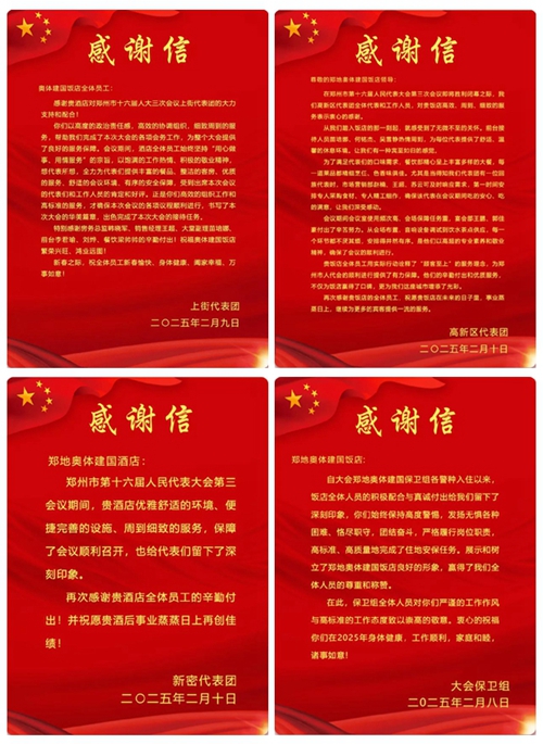 2025年2月10日,鄭州市第十六屆人民代表大會第三次會議第二次全體會議勝利閉幕。鄭州城市發(fā)展集團旗下河南鄭地奧體建國飯店作為本次大會的駐地保障酒店,以“五星”服務(wù)標(biāo)準(zhǔn)(環(huán)境舒心、食宿貼心、細(xì)節(jié)暖心、保障安心、文化潤心),圓滿完成了各項接待任務(wù),贏得了與會代表和會務(wù)組的一致好評。