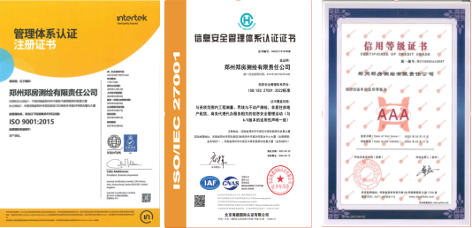 結(jié)合2019年取得的質(zhì)量管理體系(ISO9001),鄭房測(cè)繪已成功通過“三標(biāo)體系”認(rèn)證。這些榮譽(yù),不僅是公司在規(guī)范化運(yùn)營(yíng)、風(fēng)險(xiǎn)防控、精細(xì)化管理等維度交出的優(yōu)異答卷,更標(biāo)志著公司企業(yè)綜合實(shí)力和核心競(jìng)爭(zhēng)力的增強(qiáng),顯著提升公司品牌形象與市場(chǎng)信譽(yù)度,增強(qiáng)客戶對(duì)企業(yè)的信任,為深耕測(cè)繪地理信息市場(chǎng)奠定堅(jiān)實(shí)基礎(chǔ),為開啟管理升級(jí)與戰(zhàn)略躍升譜寫新篇章。