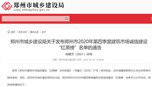 2月25日,鄭州市城鄉(xiāng)建設局發(fā)布鄭州市2020年第四季度建筑市場誠信建設“紅黑榜”名單的通告(鄭建文〔2021〕28號),鄭州地產(chǎn)集團投資管理有限公司榮登“紅榜”單位,趙玨榮登“紅榜”個人。