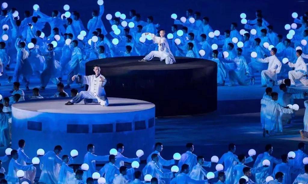 當(dāng)現(xiàn)場屏幕通過虛擬技術(shù)應(yīng)用,呈現(xiàn)出美麗的畫面,讓現(xiàn)場觀眾仿佛置身北國北川、南嶺飛瀑之中,觀眾都情不自禁地?fù)]舞起了手中的國旗為他們的表演喝彩!為我們偉大的祖國喝彩!1000架無人機從奧體中心廣場升起迅速變換成中中的造型,點燃民族運動會的火炬。